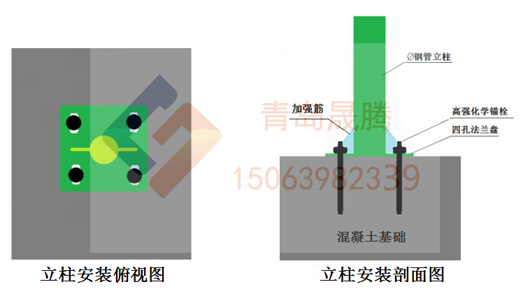 3.3組裝好一部分框架就一起扶起,第一個(gè)安裝立柱到定點(diǎn)位置后采用化學(xué)錨栓將法蘭盤固定孔位固定住,注意化學(xué)錨栓的螺帽不要擰死,然后依次順序固定;